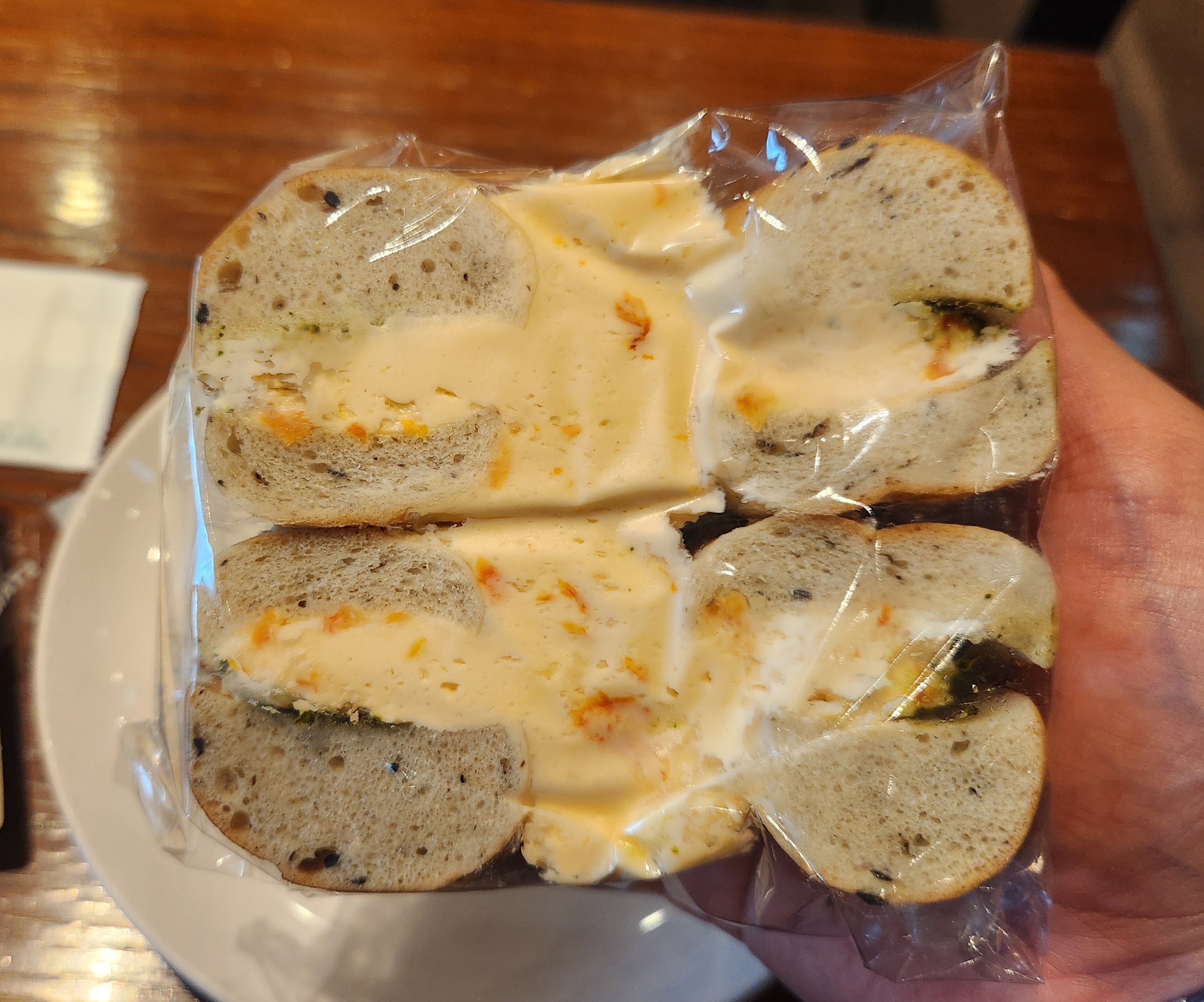 않았고 바질페스토가 베이글 윗면에