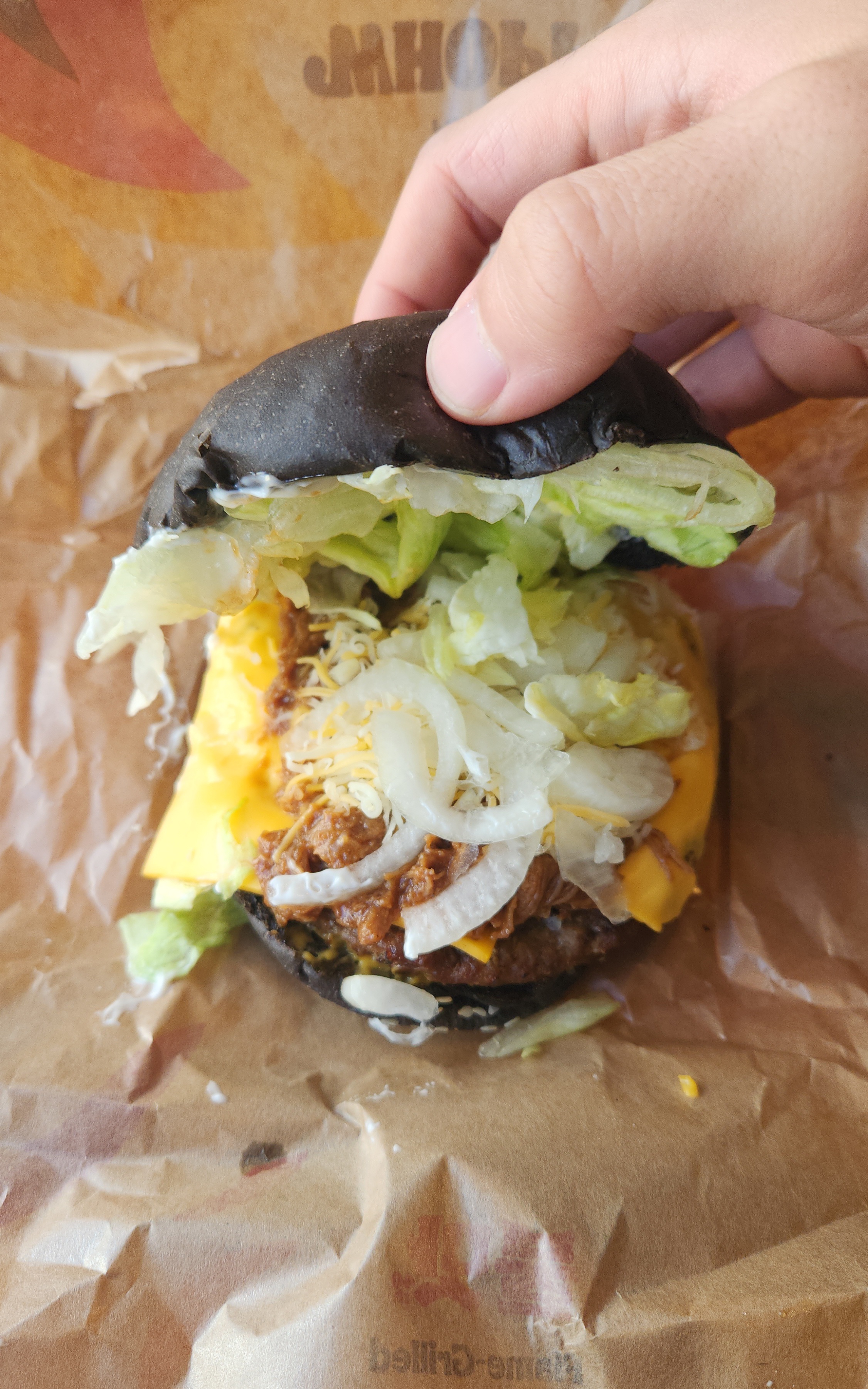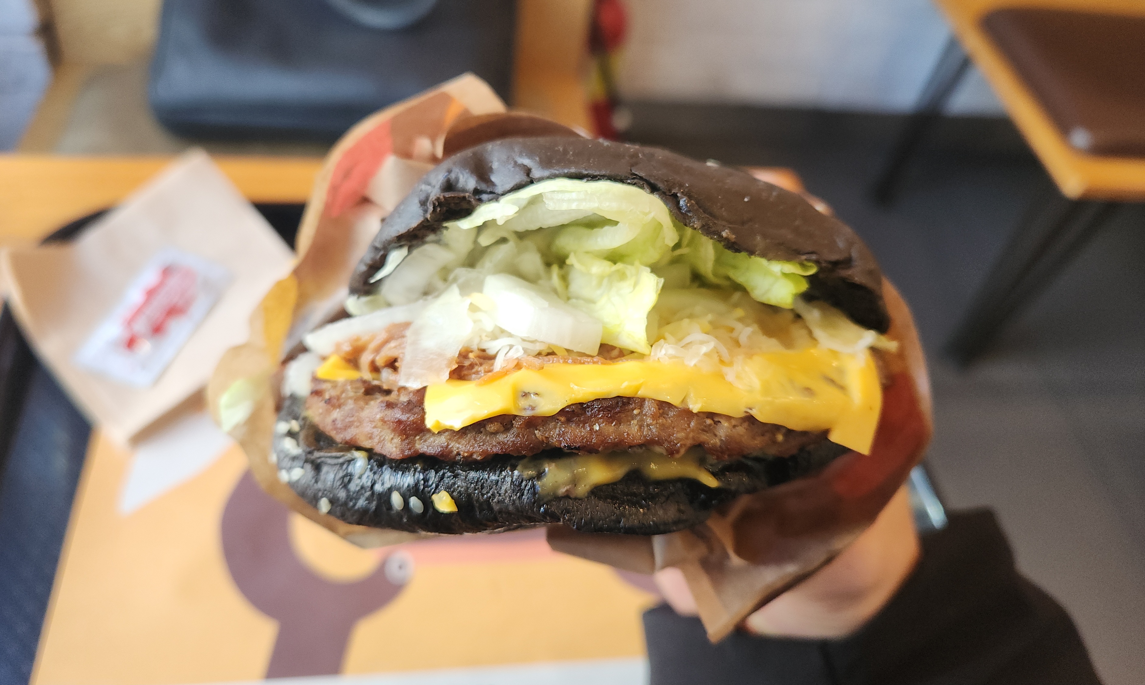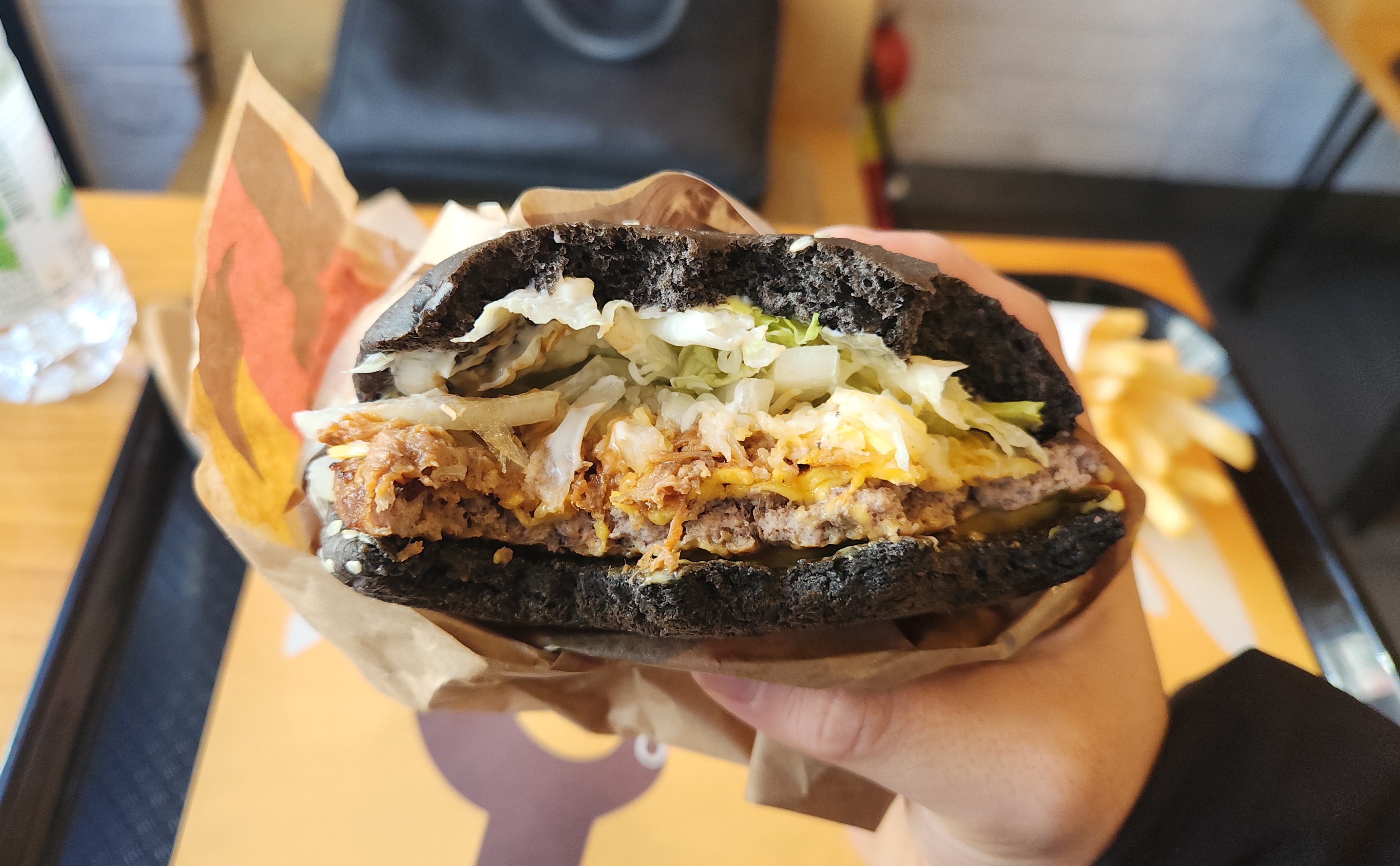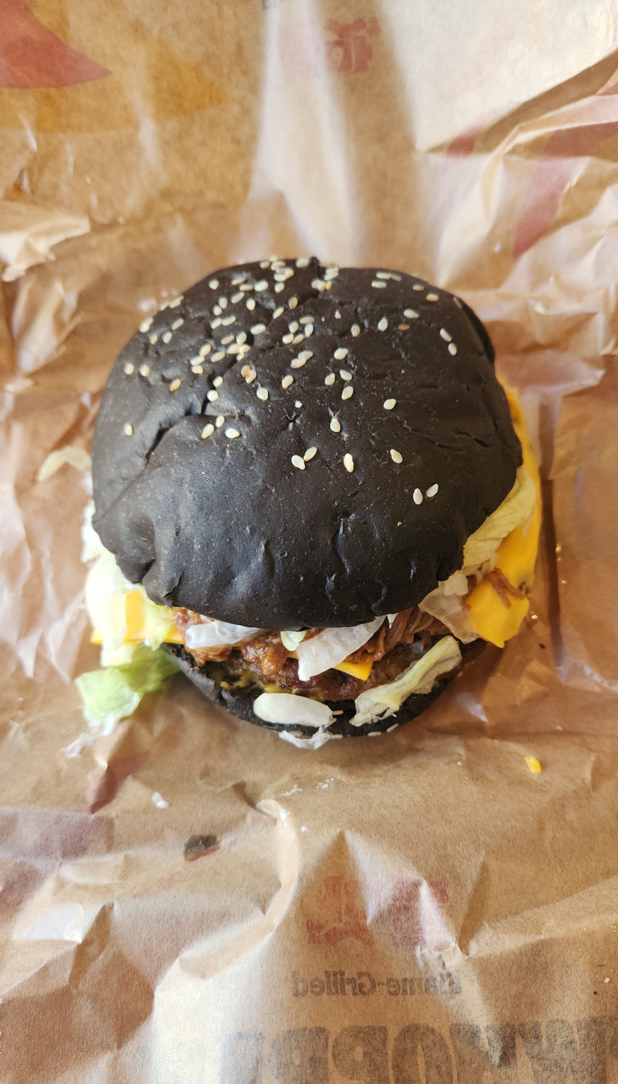 콰트로치즈 풀드비프 와퍼는 번이 블랙 번입니다.